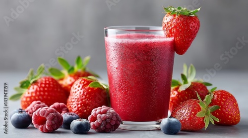 Glass of red juice with a strawberry on top. The juice is made from raspberries and blueberries