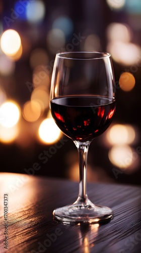 Glass of red wine elegantly placed on a dark wooden table, reflecting warm ambient light.
