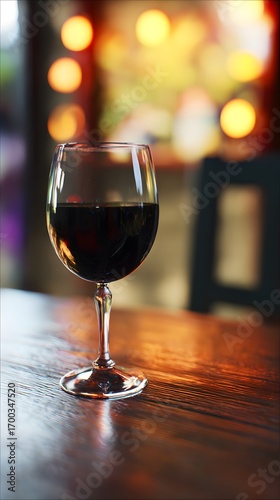 Glass of red wine elegantly placed on a dark wooden table, reflecting warm ambient light.