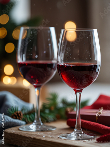 Glass of red wine in the festive Christmas and New Year atmosphere