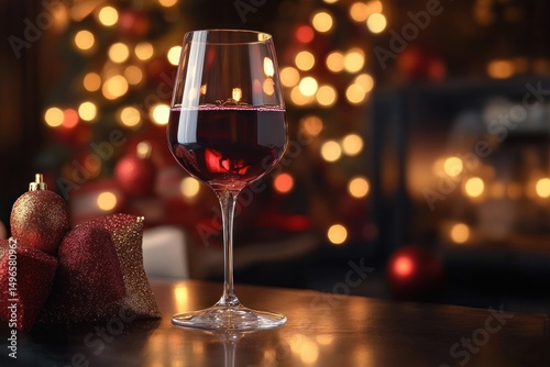 Glass of red wine on wooden table with blurred warm holiday lights and glittery Christmas ornaments in the background creating cozy festive atmosphere
