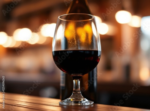 Glass of Red Wine Restaurant Setting Wine Bottle Blurred Background Drink Concept