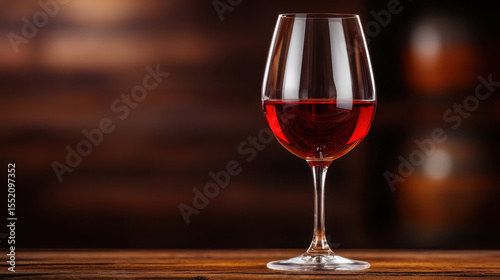 Glass of red wine sits elegantly on wooden table, showcasing its rich color and clarity, evoking sense of relaxation and indulgence