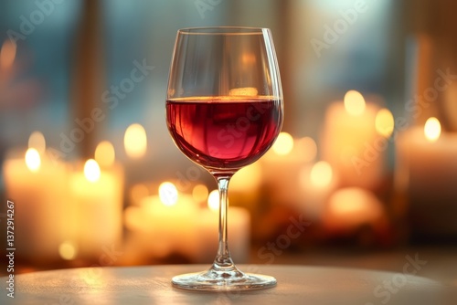 Glass of red wine sits on a table, illuminated by the warm glow of burning candles in the background, setting a romantic mood
