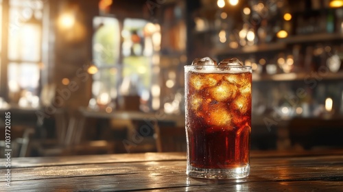 Glass of soda with ice on the bar counter, possibly in an upscale or rustic-style bar setting.