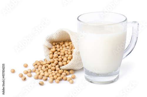 Glass of soy milk and soybeans in sack bag isolated on white background.