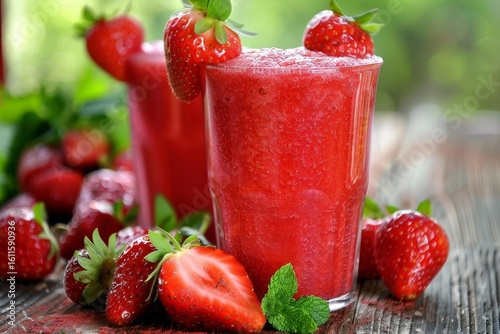 Glass of strawberry smoothie decorated with fresh strawberries and mint on rustic wooden table