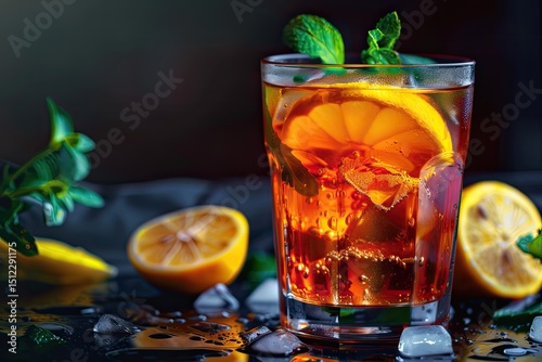 Glass of traditional iced tea garnished with lemon and mint on dark background