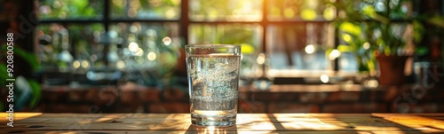 Glass of water sitting on a table with a plant in the background, Drink background, Banner, Copy space