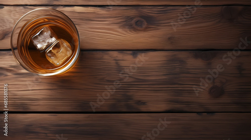 Glass of whiskey and barrel on wooden background, top view. Space for textr