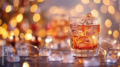 glass of whiskey on the rocks with blurred lights in the background