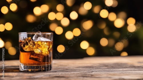 Glass of whiskey with ice blurred bokeh lights