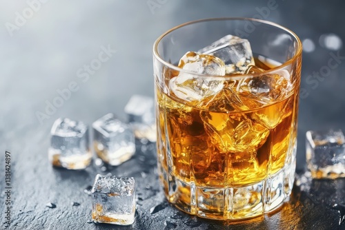 Glass of whiskey with ice cubes on black background Close up lass of whiskey with ice cubes on plain background .