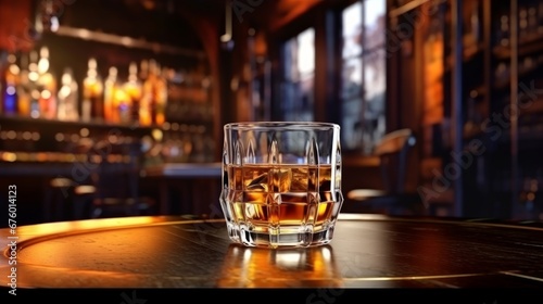 Glass of whiskey with ice cubes on wooden table in pub or bar