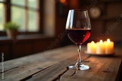 Glass of wine on a rustic wooden table with candles, rustic, table