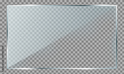 Glass plate on transparent background. Acrylic and glass texture with glares and light. Realistic transparent glass window in rectangle frame. Vector illustration