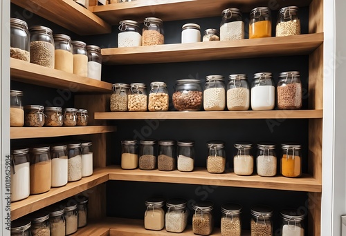 Glass reusable spice jars in a rustic wooden cabinet