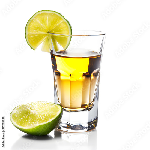 Glass shot of tequila with lime isolated on white background