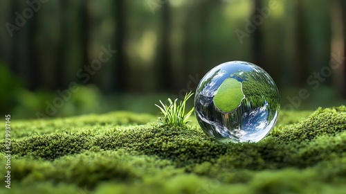 Glass Sphere Reflecting Earth in Lush Green Forest Environment