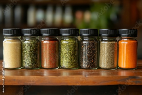Glass spice jars neatly arranged on a wooden shelf