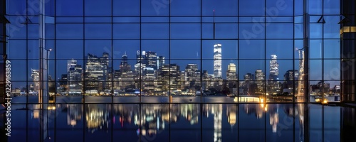 Glass surface facade mirroring an iconic skyline in evening light, AI generated
