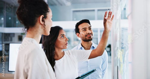 Glass wall, planning and business people in office, cooperation and conversation for project. Employees, feedback and PR agency with ideas, brainstorming and support for proposal, tablet and teamwork