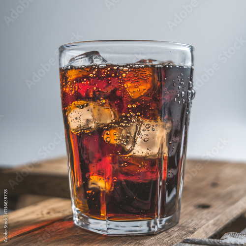 glass with cola bubbles and ice on white background, isolated.