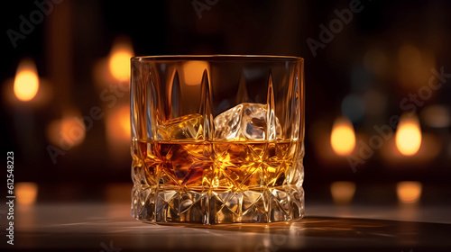 Glass with whiskey and ice cubes on the table, warm cozy atmosphere.