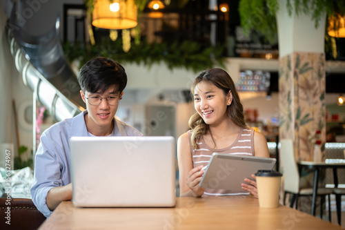 Glasses asian man and woman holding tablet looking happy at laptop on wood table in cafe or canteen.