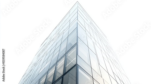 Glass-fronted office tower with clean, straight lines and sharp angles, isolated on white background
