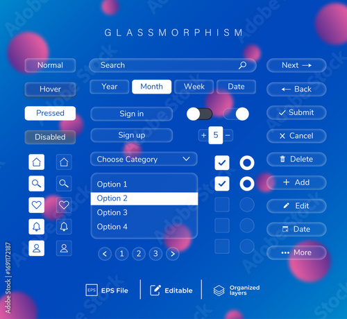 Glassmorphism UI Kit – Modern Web & App Interface Elements (Buttons, Forms, Menu, Icons, Widgets)