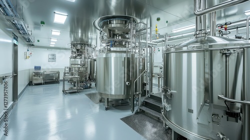 Gleaming stainless steel tanks in a modern pharmaceutical manufacturing facility with sterile cleanroom environment and advanced equipment for drug production