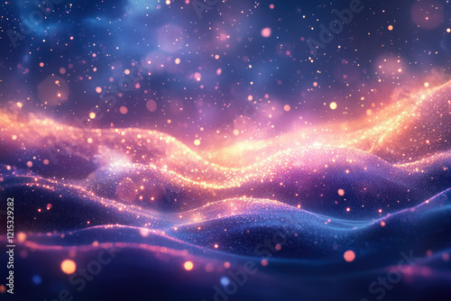 Glimmering cosmic landscape, vibrant hues of purple, pink, and gold sparkle across undulating hills.