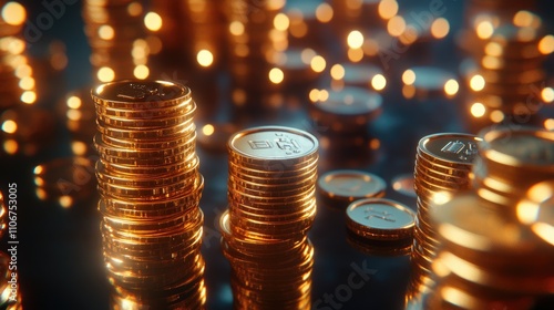 Glimmering Golden Coins Stacked with Bokeh Lights Background