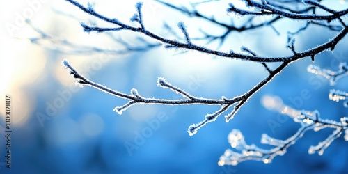 Glistening frost-covered branches sparkling in the early morning sunlight, intricate winter patterns glowing