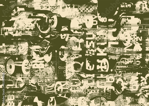 Glitch distorted grungy abstract forms . Cyber punk pattern texture. Halftone dots .Futuristic background . Glitched shapes with dots and lines .Screen print pattern texture