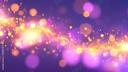 Glittering pink and purple particles with shimmering golden bokeh lights against a soft, blurred background creating a dreamy atmosphere.