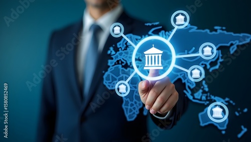 Global Banking Concept: A suited individual interacts with a holographic world map interface. symbolizing global finance and interconnected banking systems and digital era.