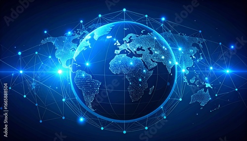 Global business communication network connects continents, with a light blue digital sphere and globe illustration