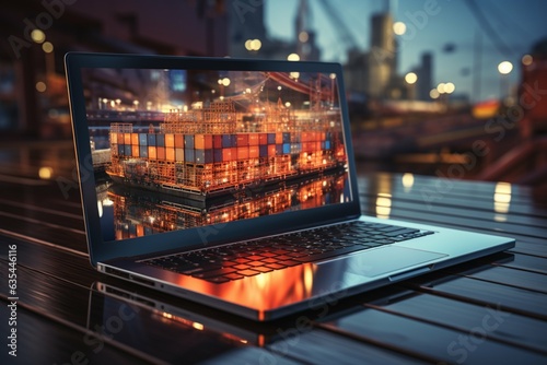 Global business depicted by cargo ship, laptop, symbolizing logistic and technology synergy Generative AI