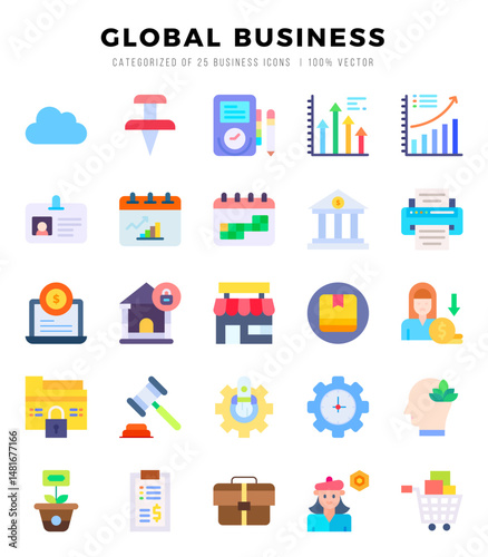 Global Business elements. Flat web icon set. Simple vector illustration.