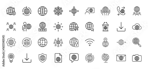 Global communication line icon set. Vector pictograms of worldwide network, internet, business, and travel concepts, thin linear illustration.