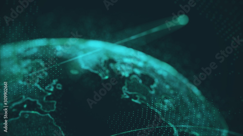 Global communication technology and telecommunication financial network around planet Earth. Blockchain and cryptocurrency concept with copyspace. Green tone
