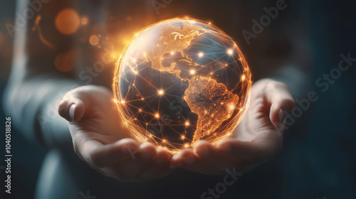 Global connection concept featuring a digital planet held in hands, symbolizing network connections, international significance, and the impact of networking technologies on social interaction.
