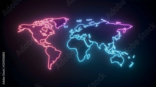 Global Connections: A vibrant neon world map illuminates continents in contrasting hues, symbolizing interconnectedness and a dynamic world stage. Explore the glowing pathways!