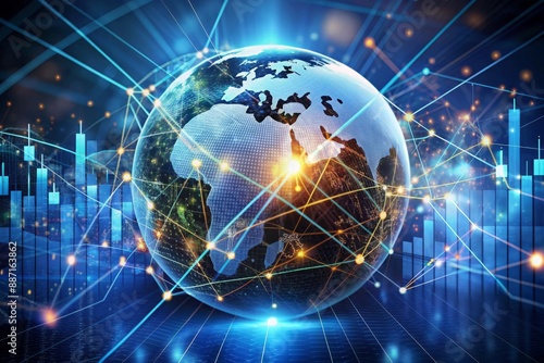 Global connections and financial success concept: digital globe surrounded by links, graphs, and charts, symbolizing international business and market growth networks.