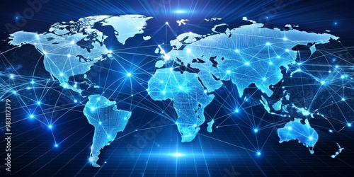 Global Connectivity Grid Symmetrical World Map with Glowing Blue Lines Illustrating Technological Interconnectedness and Globalization in Shades of Calm Blue