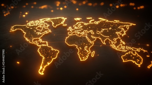 Global connectivity through neon lights world map digital art futuristic environment aerial view technology concept