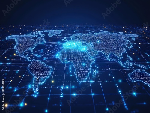 Global Connectivity Vector Design: White World Map on Blue Grid with Abstract Data Flow for Tech Advertising