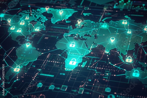 Global Cybersecurity Network Map with Lock Symbols and Connections